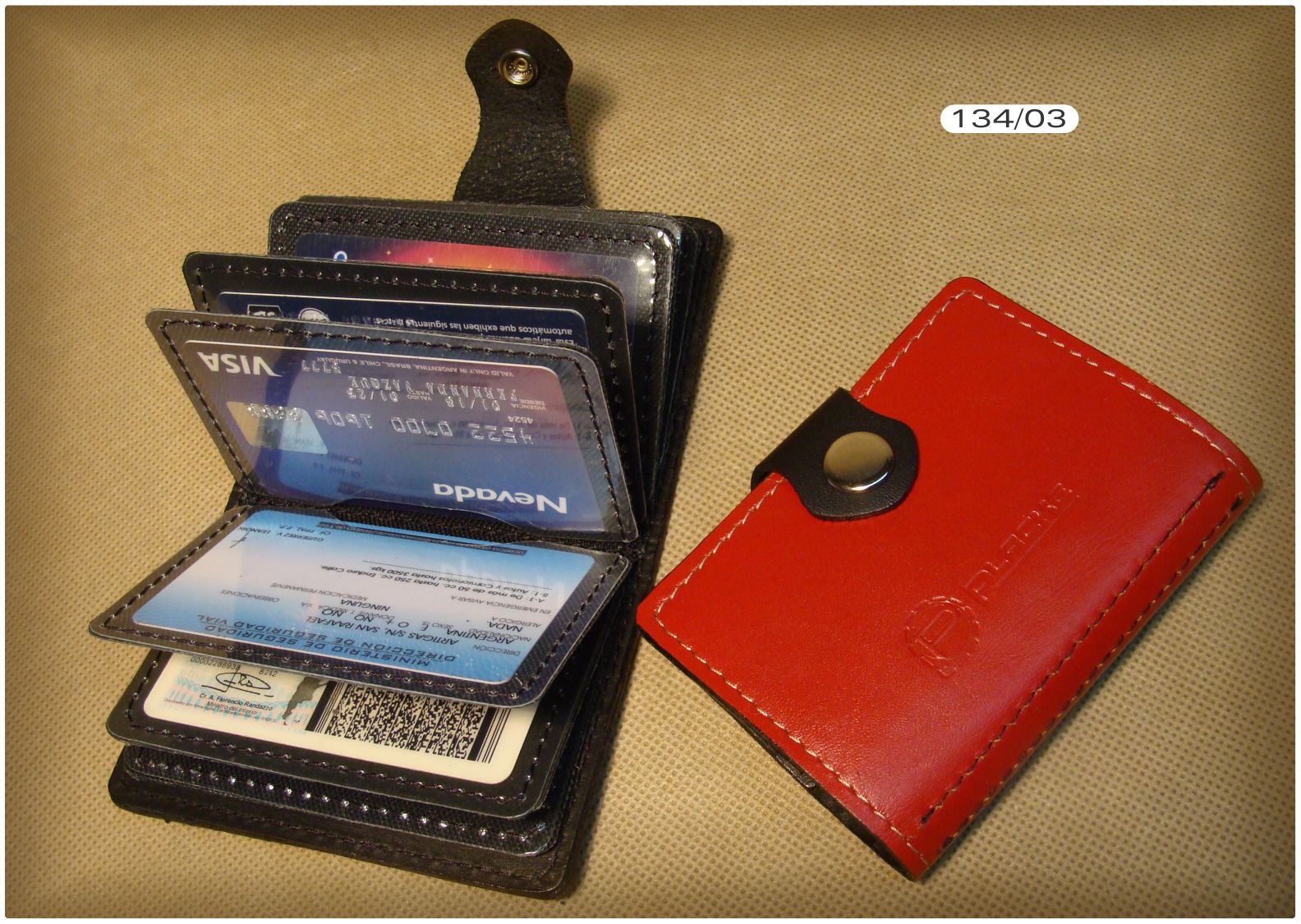 TARJETERO VENTANA CRISTAL, para 18 tarjetas, de cuero, cierre con broche.
