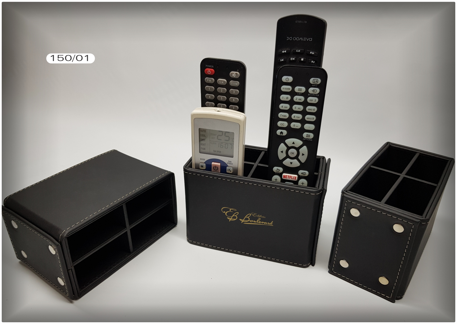CAJA PORTA CONTROLES. Caja de cuero ecológico con 4 separaciones para controles remotos. Un grabado láser. Medida: 14 x 10 x 7 cm,