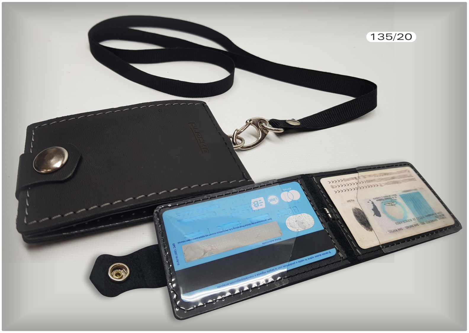Porta CREDENCIAL, tamaño tarjeta de crédito con correa y mosquetón, de cuero o cuero ecológico, interior PVC transparente. Medida: 6,5 x 10 cm.