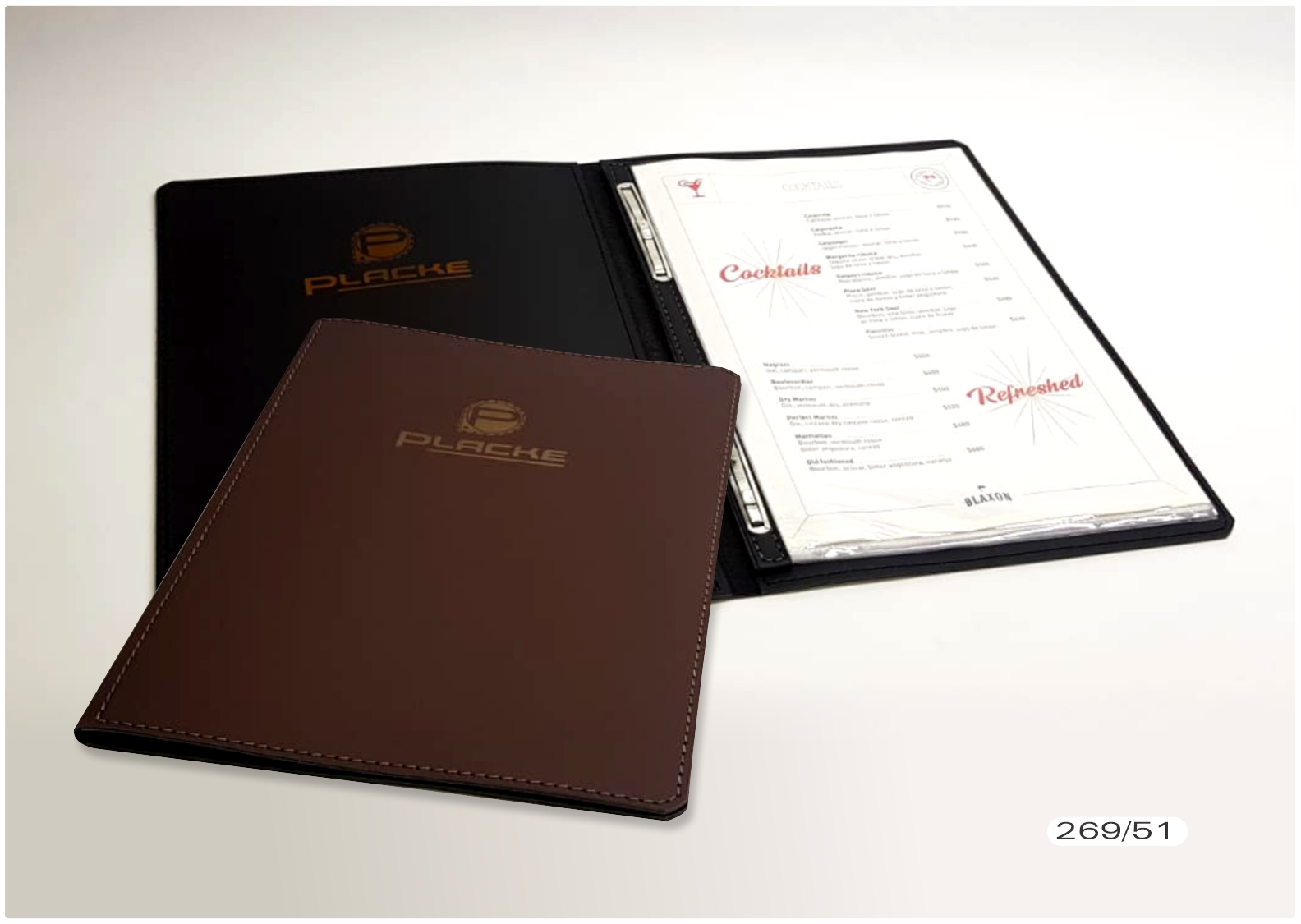 CARTA MENÚ IMPEGNO DOBLE CON 6 FOLIOS, tamaño A4, confeccionada en impregno doble, nervio reforzado con doble gancho para 6 folios desmontables de librería. Un grabado láser. Medida: 33 x 24 cm.