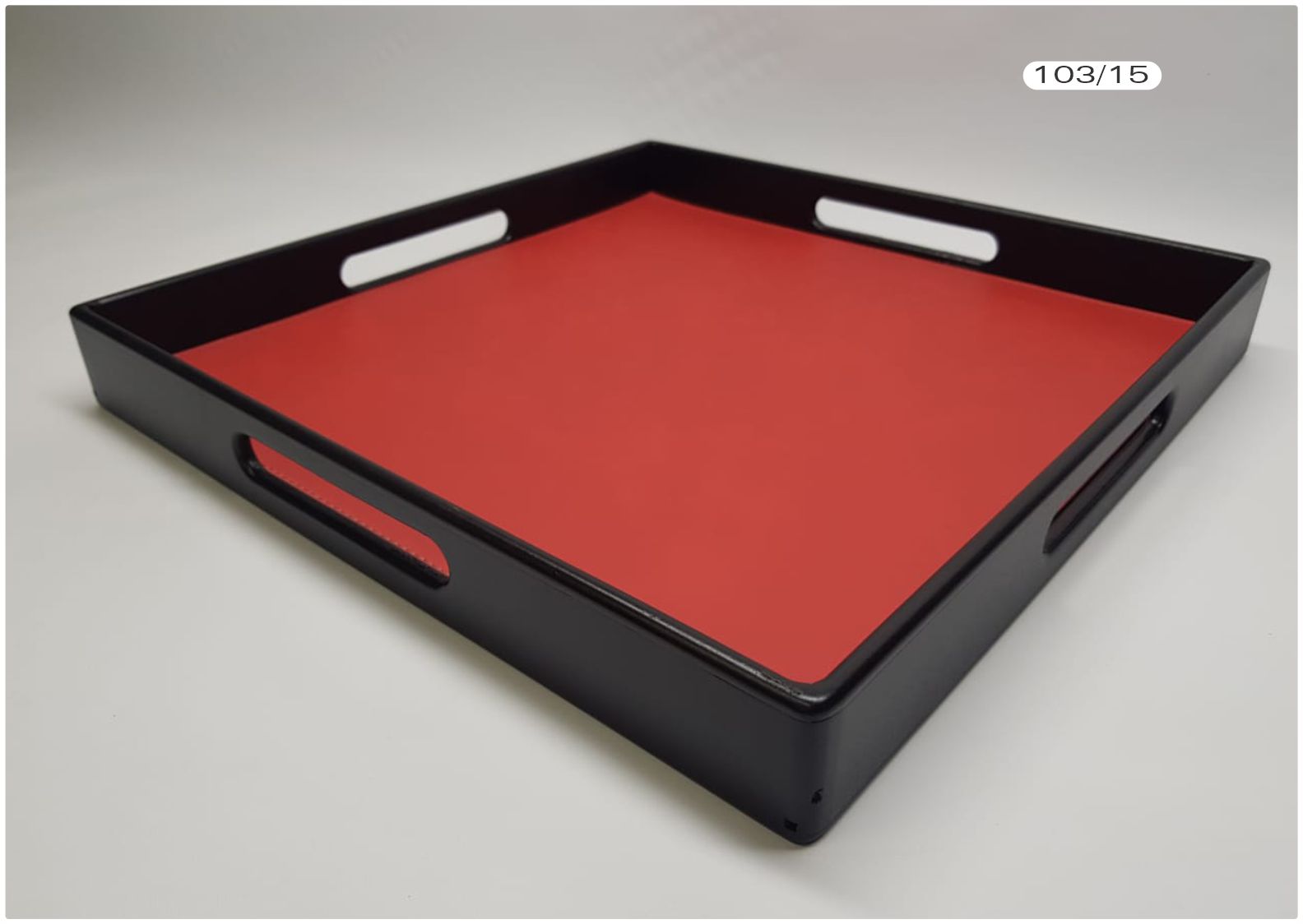 BANDEJA MDF con 4 aberturas manijas. Medida: 40 x 40 x 5 cm.