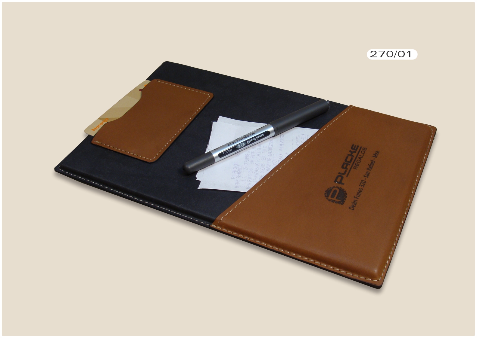 BANDEJA DE COBRANZA, dos bolsillos para factura y porta tarjeta de crédito. Medida: 16,5 x 26 cm.