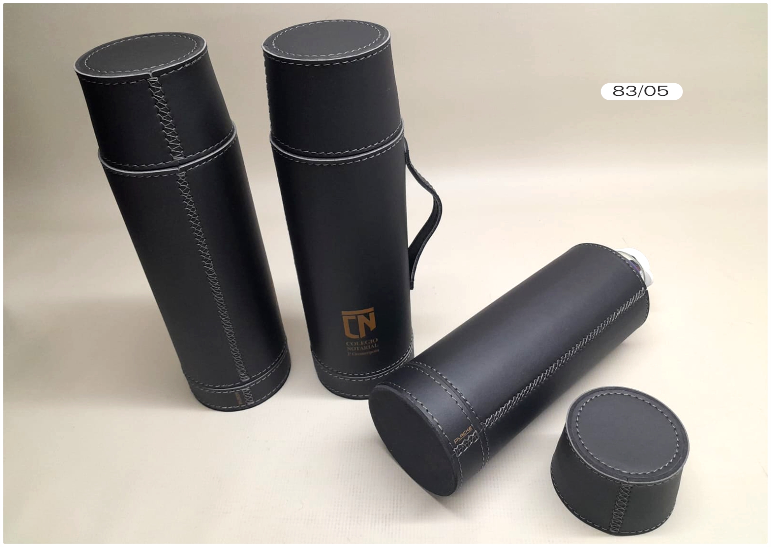 TERMO LUMILAGRO VIDRIO SIN MANIJA TAPA FORRADA. Termo Lumilagro repuesto vidrio, con funda de cuero ecológico semirrígido, con tapa forrada, costura artesanal. Grabado láser.
