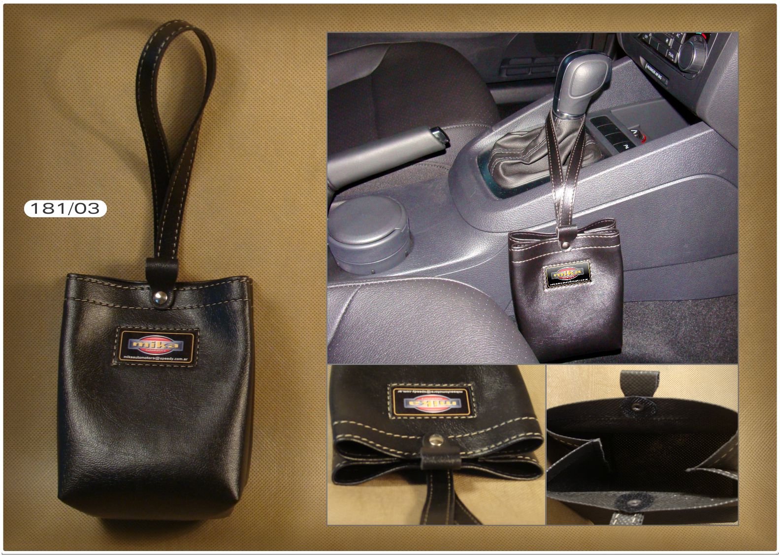 BOLSITA para auto de cuero ecológico aplique acrílico full color; correa y cierre con abrojo. Medida: 14 x 10 x 8,5 cm.