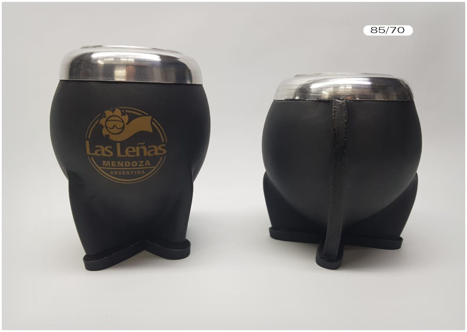 MATE URUGUAYO SIMIL SIN COSTURA. Mate de calabaza seleccionada forrado en cuero ecológico negro, virola de aluminio, tamaños variables mediano-grande, un grabado láser. Medida: 13 x 9 cm