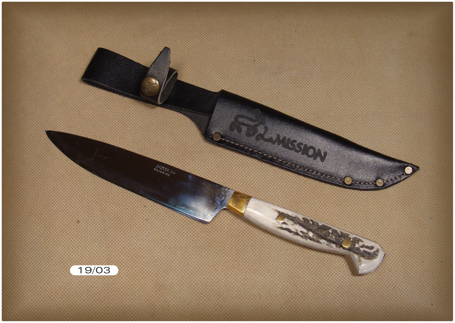 Cuchillo ARTESANAL ,hoja inox 12 cm. , cabo ciervo y bronce con vaina de cuero