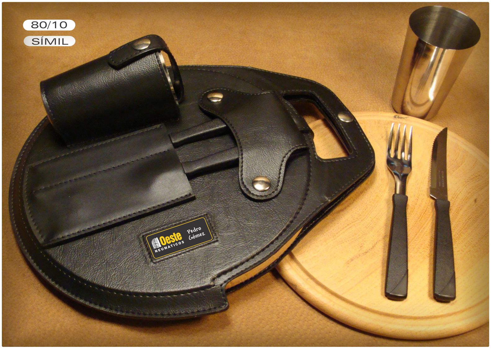 Porta plato ESPECIAL x1, CON VASO, estuche de cuero ecológico aplique acrílico; contiene un plato de madera 24 cm, juego de cubiertos cabo plástico, y vaso acero inox.