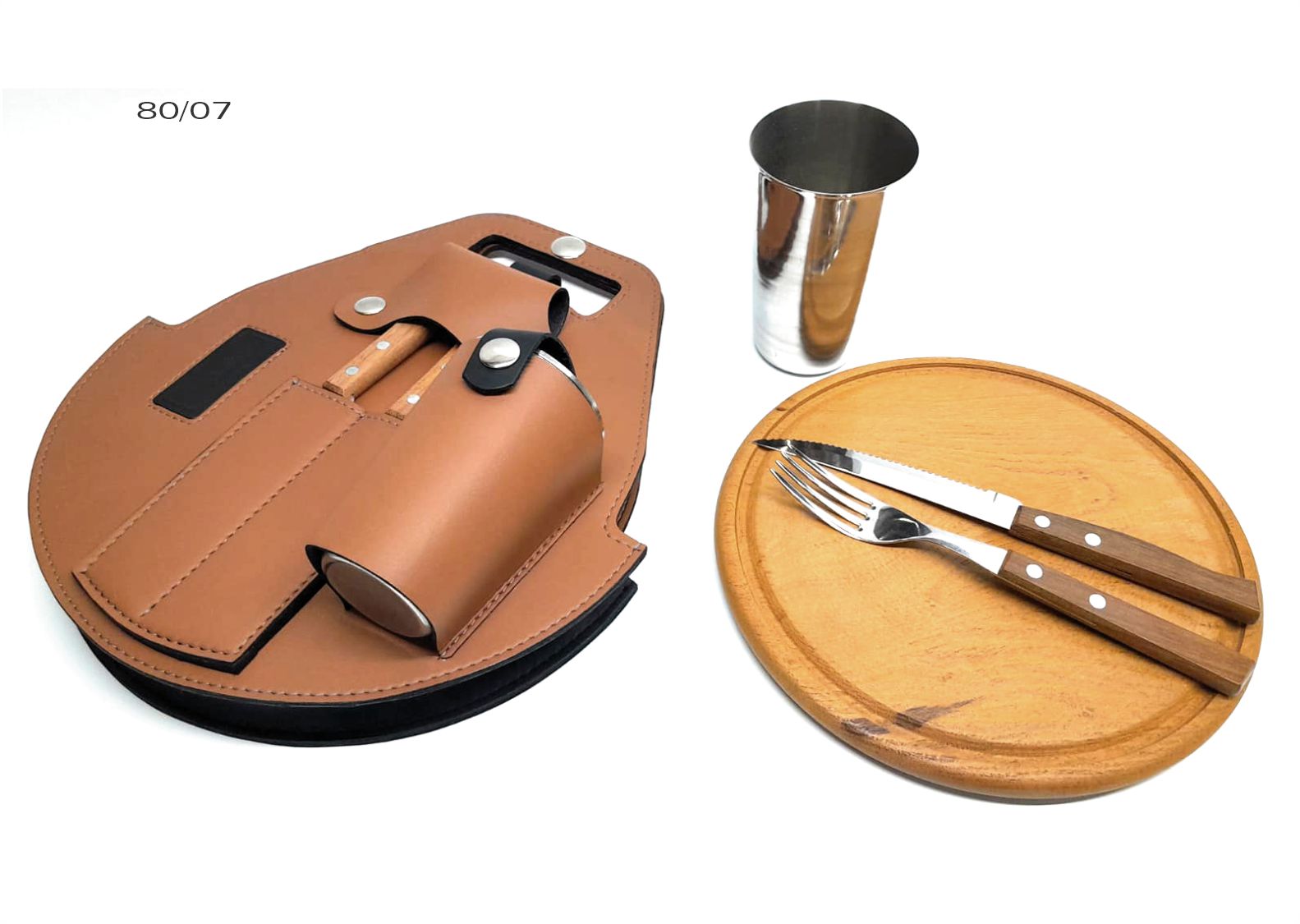 Porta plato SIMPLE x1, CON VASO, estuche de cuero ecológico con solapa para cubiertos, aplique acrílico; contiene plato madera de 22 cm juego de cuchillo y tenedor cabo plástico, y vaso de acero inox.