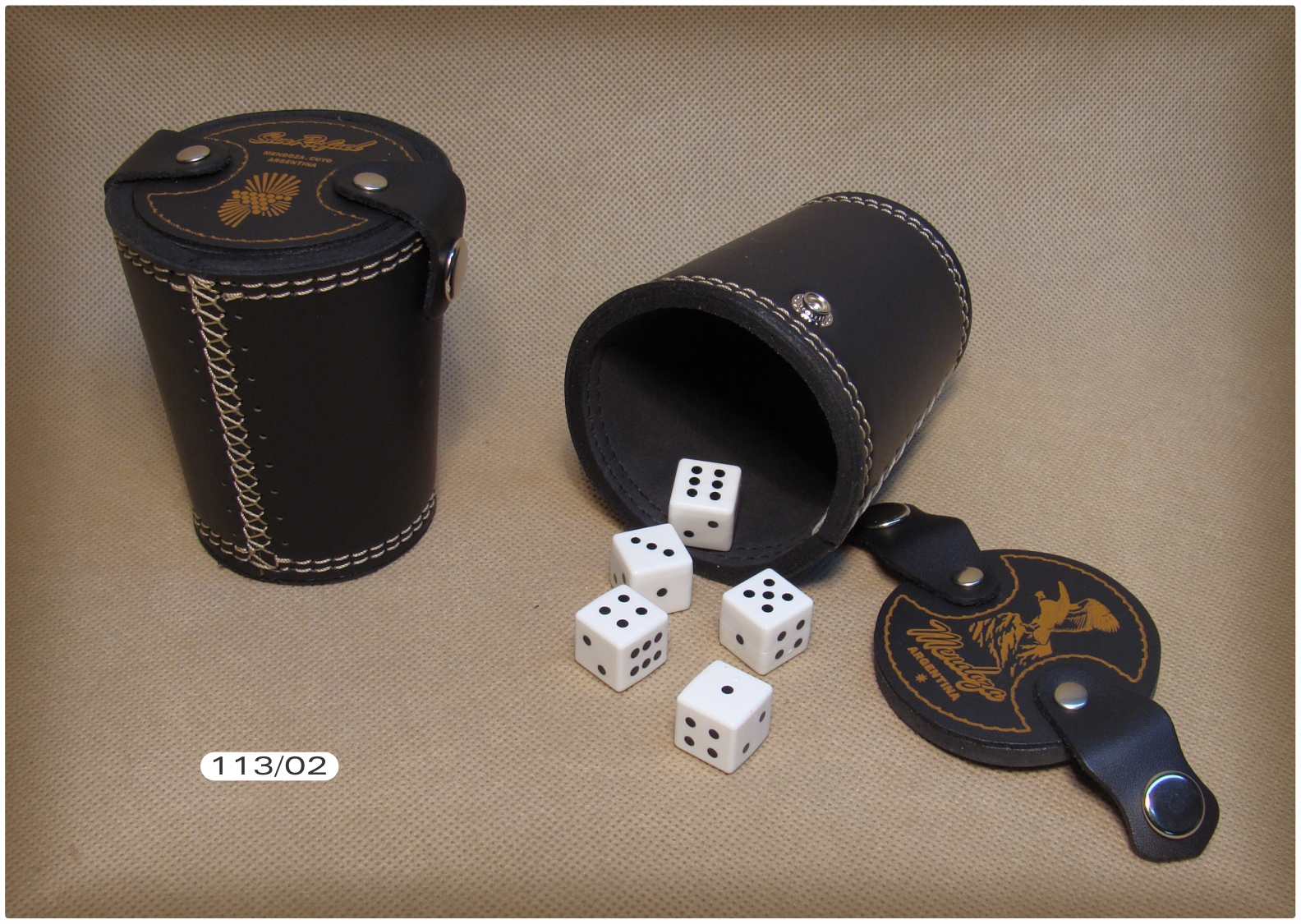 CUBILETE CON TAPA de cuero, medidas: alto 10 x 7 cm. de boca. Cosido a mano, interior de goma. Con 5 dados y tapa de cuero.
