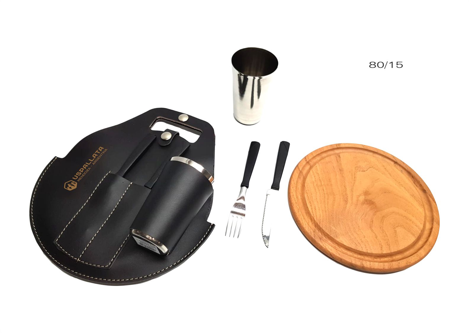 Porta plato ECO CON VASO, estuche de cuero ecológico SIN FORRAR, con plato 22 cm, vaso de acero inox. y juego de cuchillo y tenedor cabo plástico. Grabado láser 15 cm2.