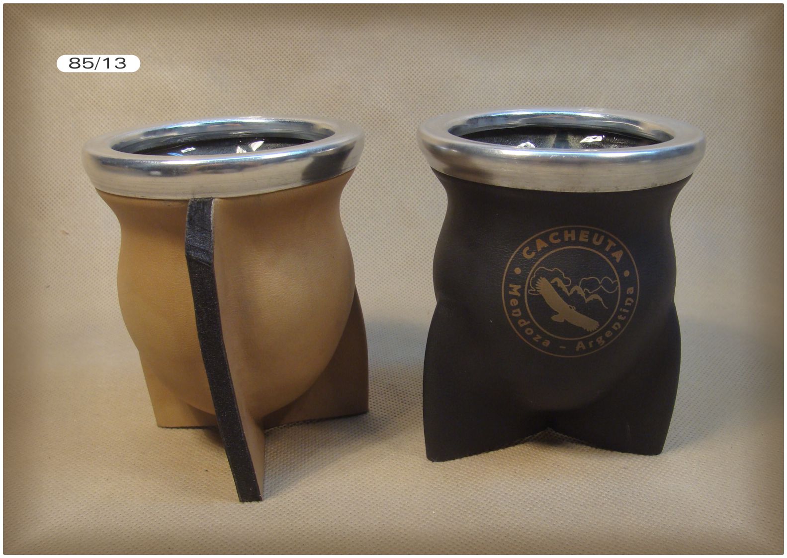 MATE 3 CARAS CUERO, interior vidrio, forrado en goma y cuero. Impresión láser.