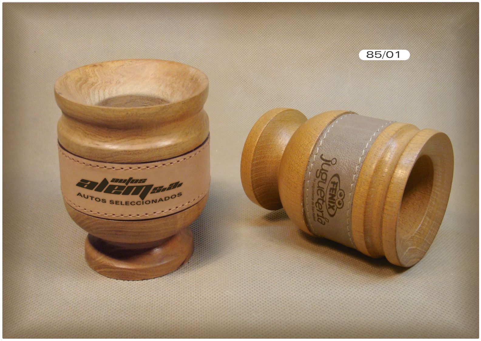 Mate de madera CON PIE, faja de cuero o cuero ecológico grabada en láser. Medida: 10 x 7 cm.
