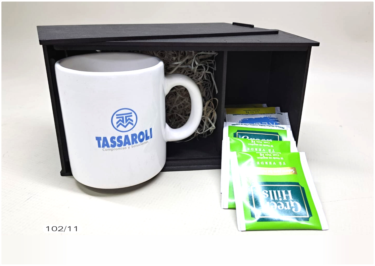 Caja de mdf con división y tapa corrediza. Contiene 1 taza blanca frente y dorso sublimados, y 10 sobres de té.