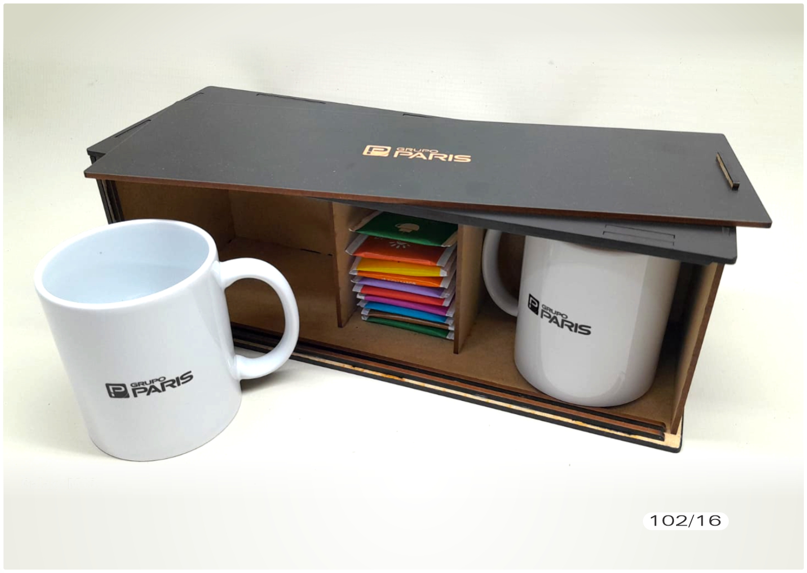 Caja de mdf NEGRO con división y tapa corrediza, con 2 tazas blancas frente y dorso sublimados, y 10 sobres de té,