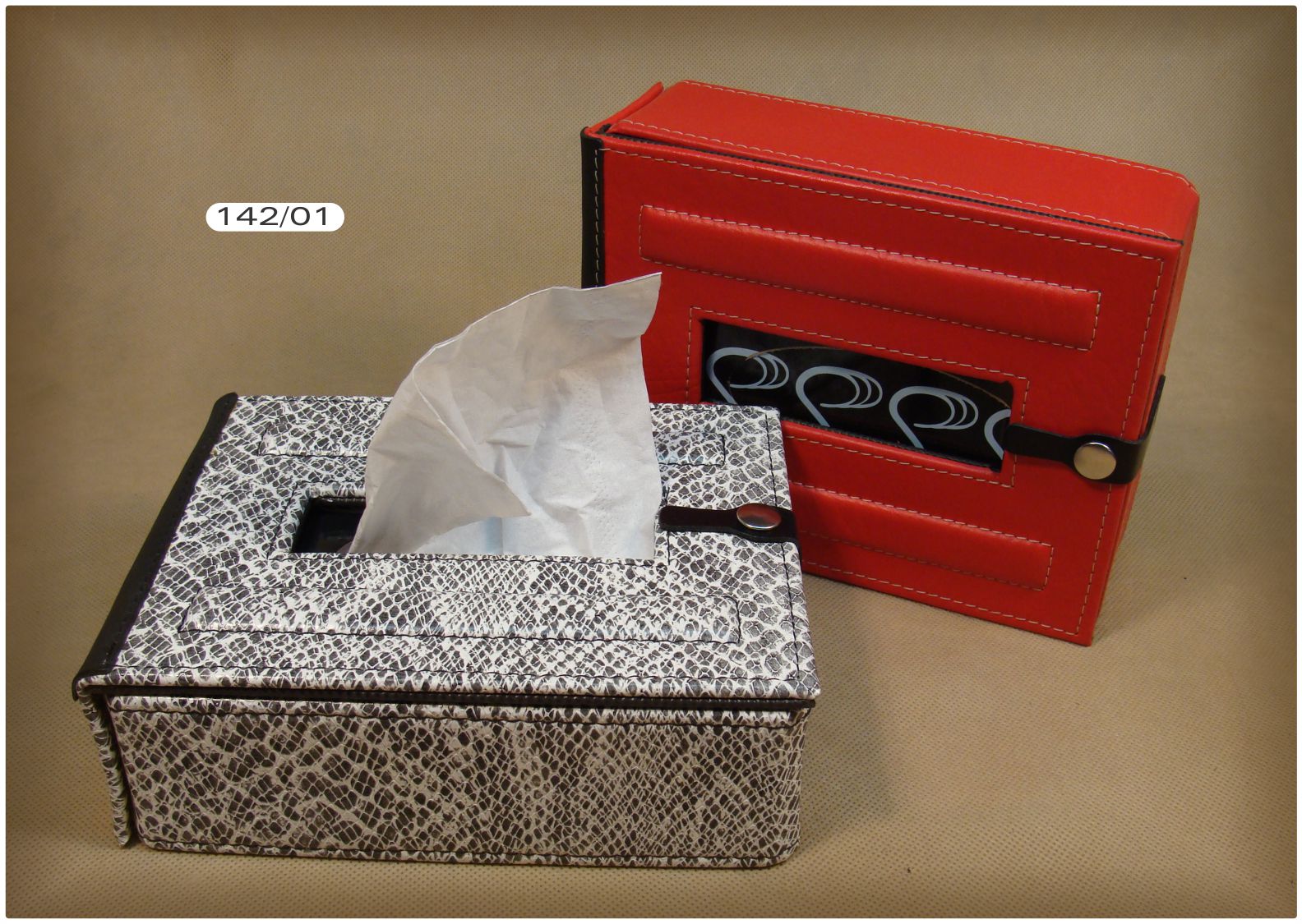 PORTA CAJA DE PAÑUELOS. Caja de cuero ecológico color, cierre con broche, aplique acrílico full color, para caja de pañuelos desechables, repuesto renovable.