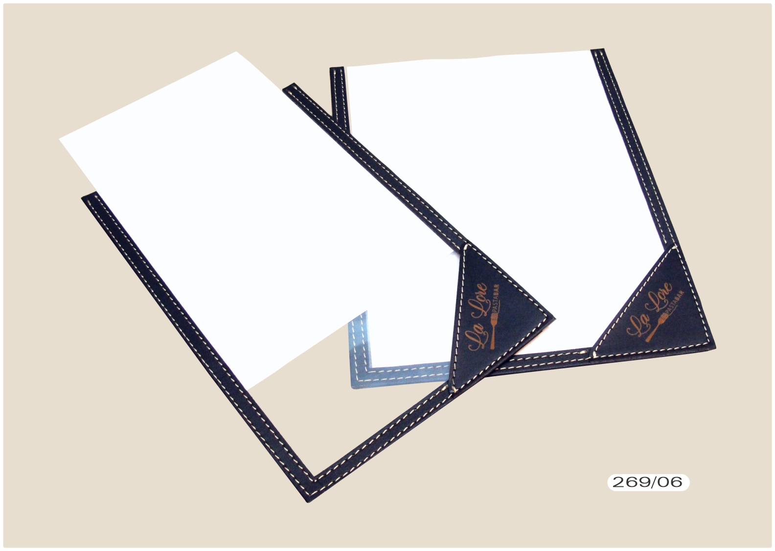 HOJA MENÚ SIMPLE, acrílico doble contorno cuero ecológico, aplique grabado láser. Tamaño A4.