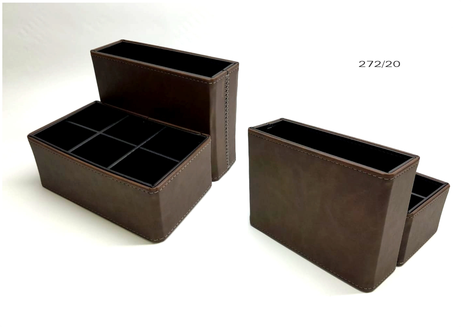 SERVILLETERO VERTICAL CON PORTA ADHERESO, de cuero ecológico. Un grabado láser. Medida: Base 19,5 x 18 x 14 cm,