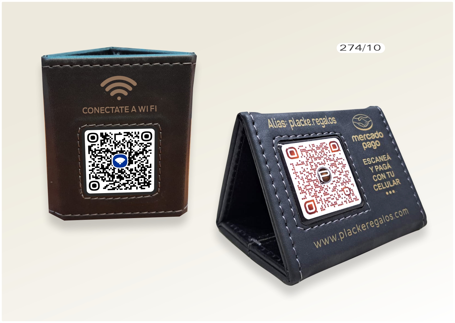 PORTA QR CARPITA TRIANGULAR x3, de cuero ecológico, con 3 ventanas acílicas y 3 grabado láser.