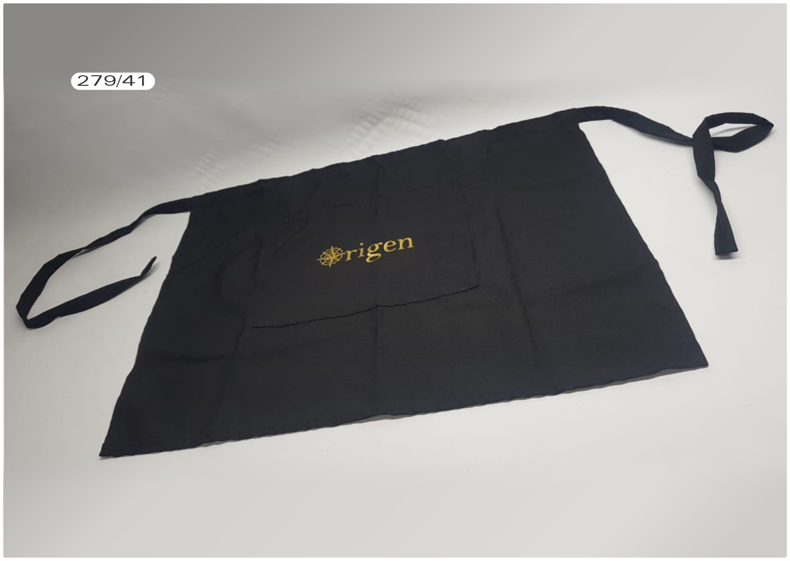 Delantal faldón confeccionado en tela mecánica negra, con un grabado en vinilo textil termotransferible.