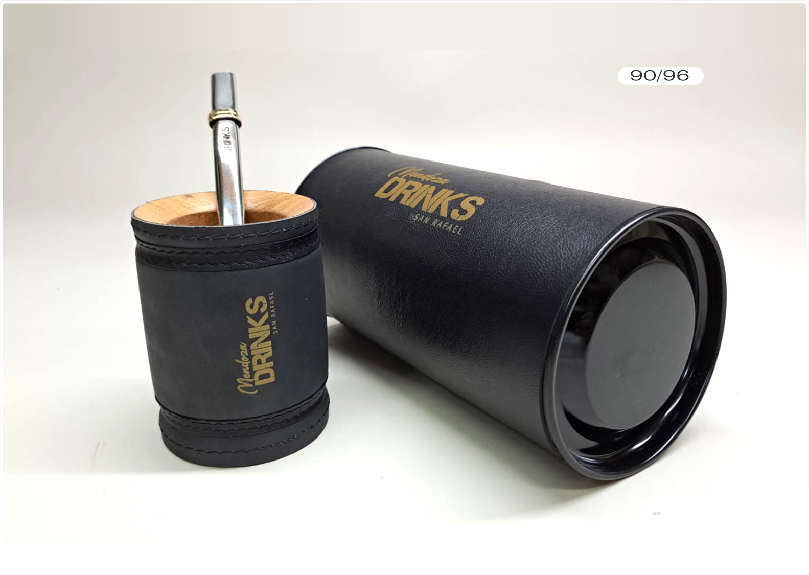 Mate cuyano, con bombilla chata ancha. En tubo forrado en folia con manija arriba interior goma. Un grabado láser en cada elemento.